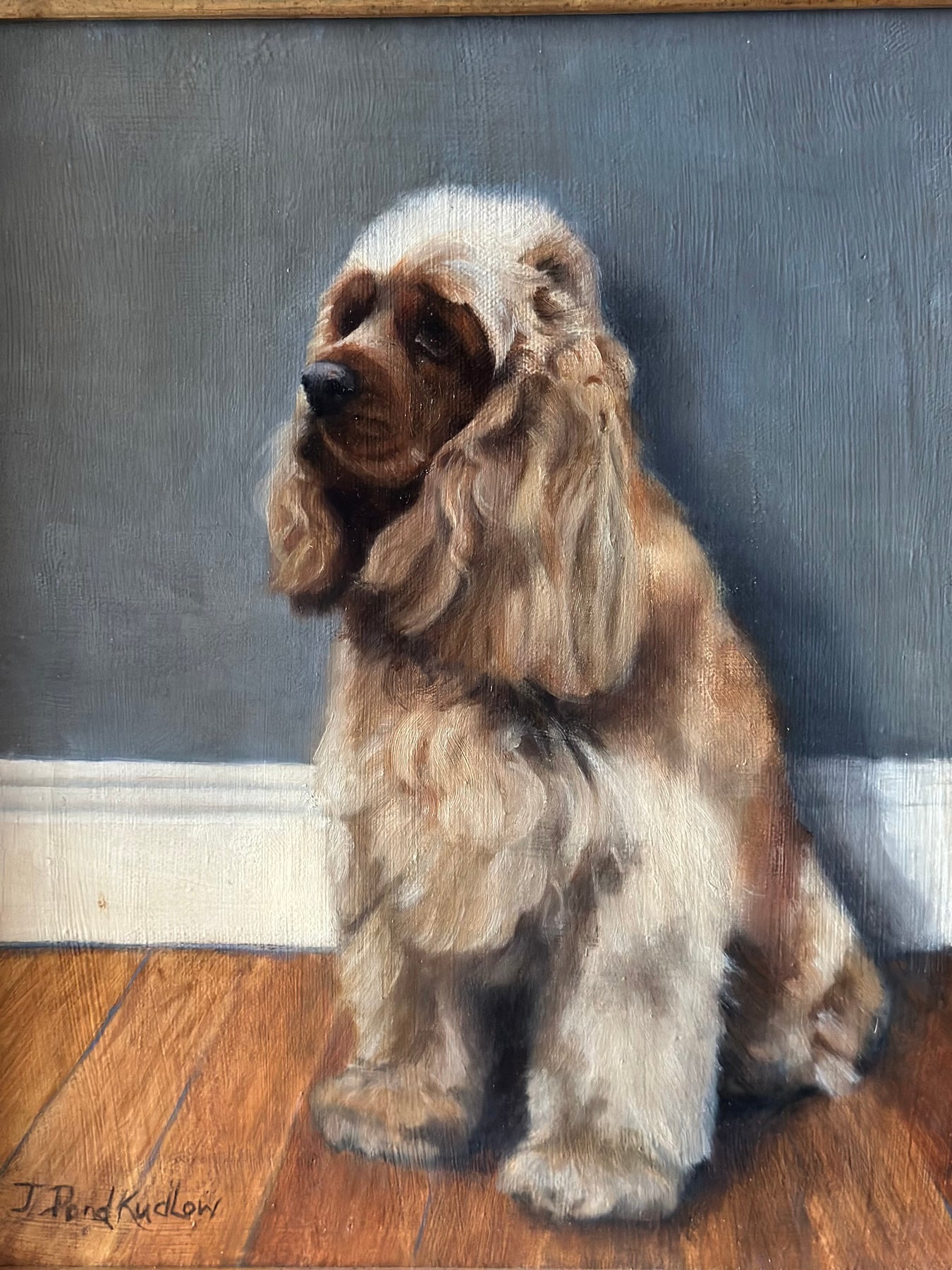 A charming 20th century oil on canvas depicting a long-haired spaniel, rendered with striking naturalism and sensitivity. The artist captures the dog seated against a muted grey backdrop, its soft coat and expressive eyes illuminated with a subtle play of light. The composition emphasizes both the gentle character of the animal and the timeless elegance of the breed, making it an endearing portrait suited to both traditional and eclectic interiors.