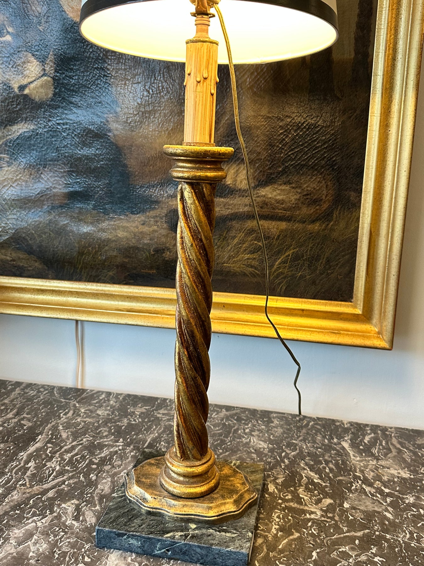 A striking Italian table lamp featuring a hand-carved barley twist column in richly patinated giltwood. The sculptural silhouette rests on a shaped giltwood plinth and a solid green marble base, grounding the design with texture and weight.