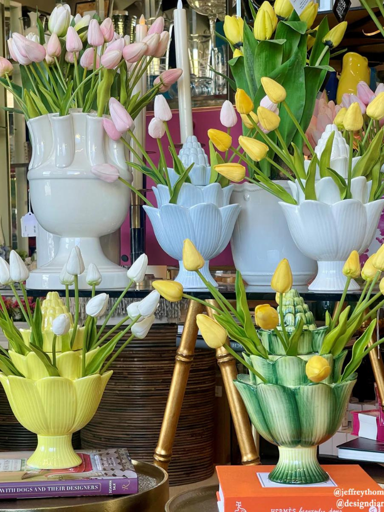 Tulipieres are self-arranging floral vessels.  Dating to the early 17th century, tulipieres were designed to display the blooms of prized tulip bulbs. Hand painted.