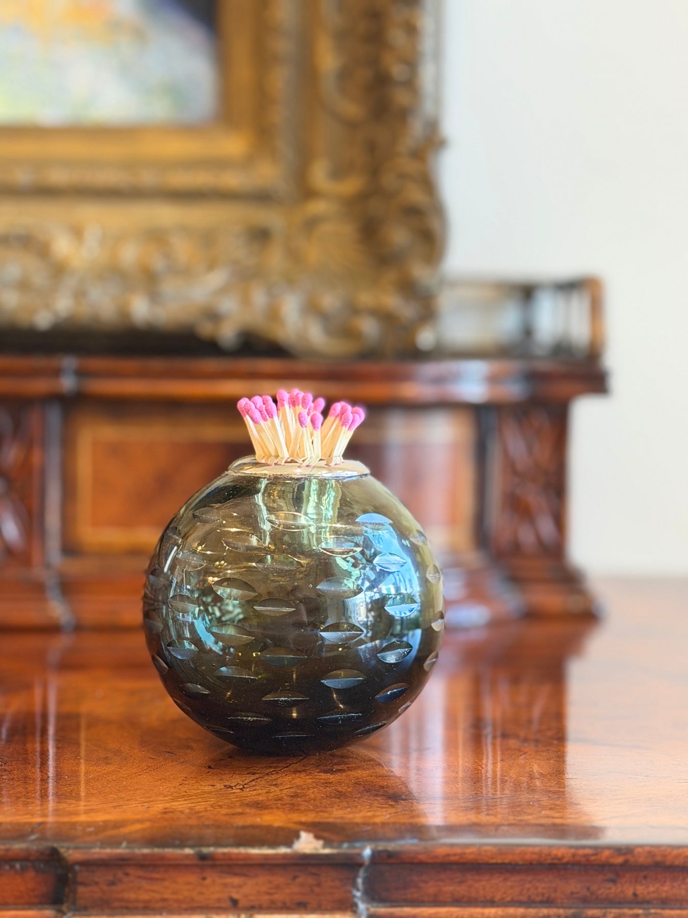A beautifully weighted and sculptural glass match striker inspired by the refined table objects found throughout Europe in the late 19th and early 20th centuries. Traditionally, match strikers were essential fixtures in elegant homes — placed beside hearths, atop writing desks, or on cocktail tables — where they served as both a practical tool and a decorative accent. Early examples appeared in cut crystal, bronze, porcelain, or pressed glass, each designed to elevate the simple act of striking a match into a small moment of ceremony.