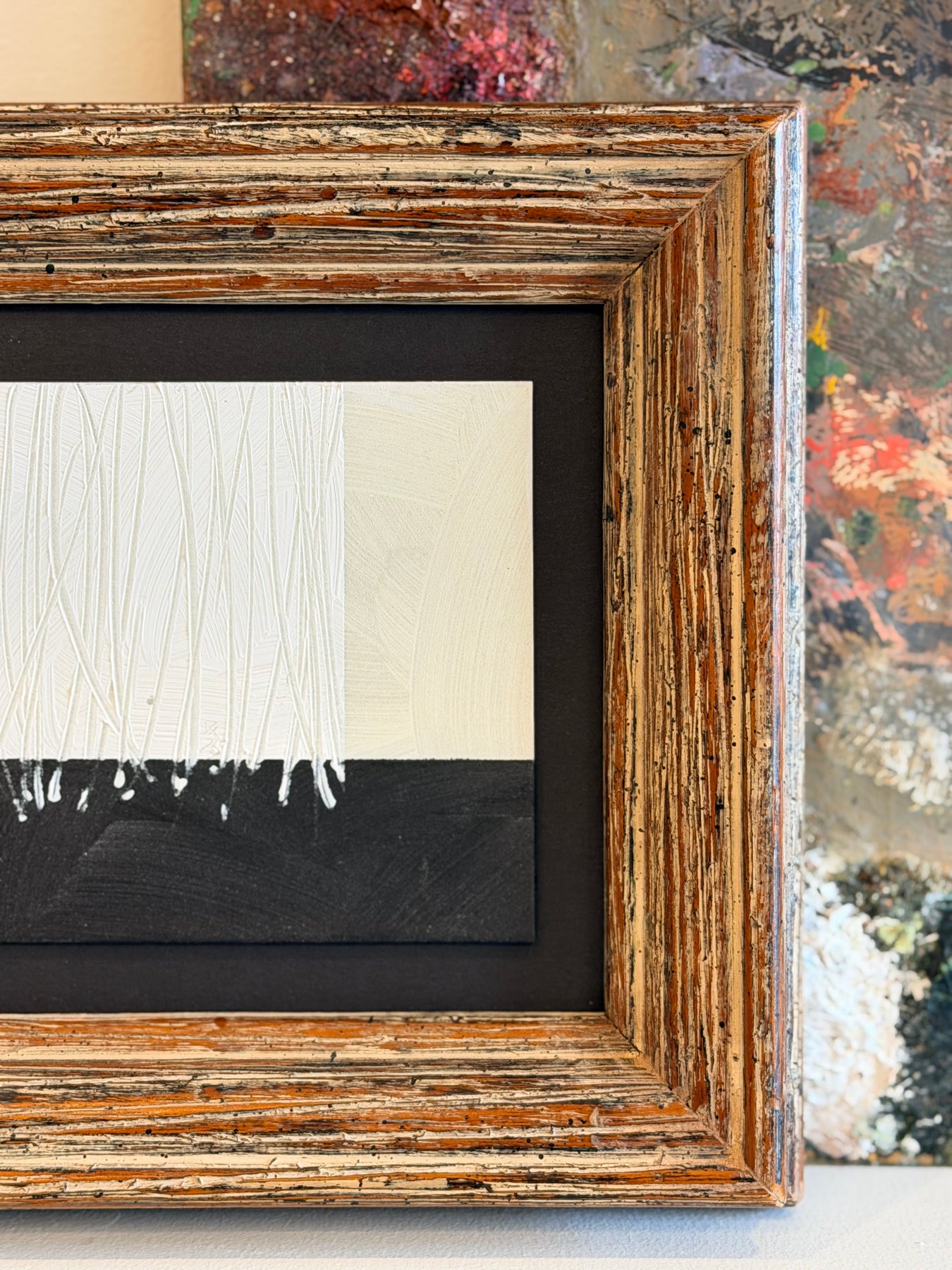 The painting is elegantly housed in a rustic custom wood frame, which adds warmth and dimension to the stark, modernist composition.