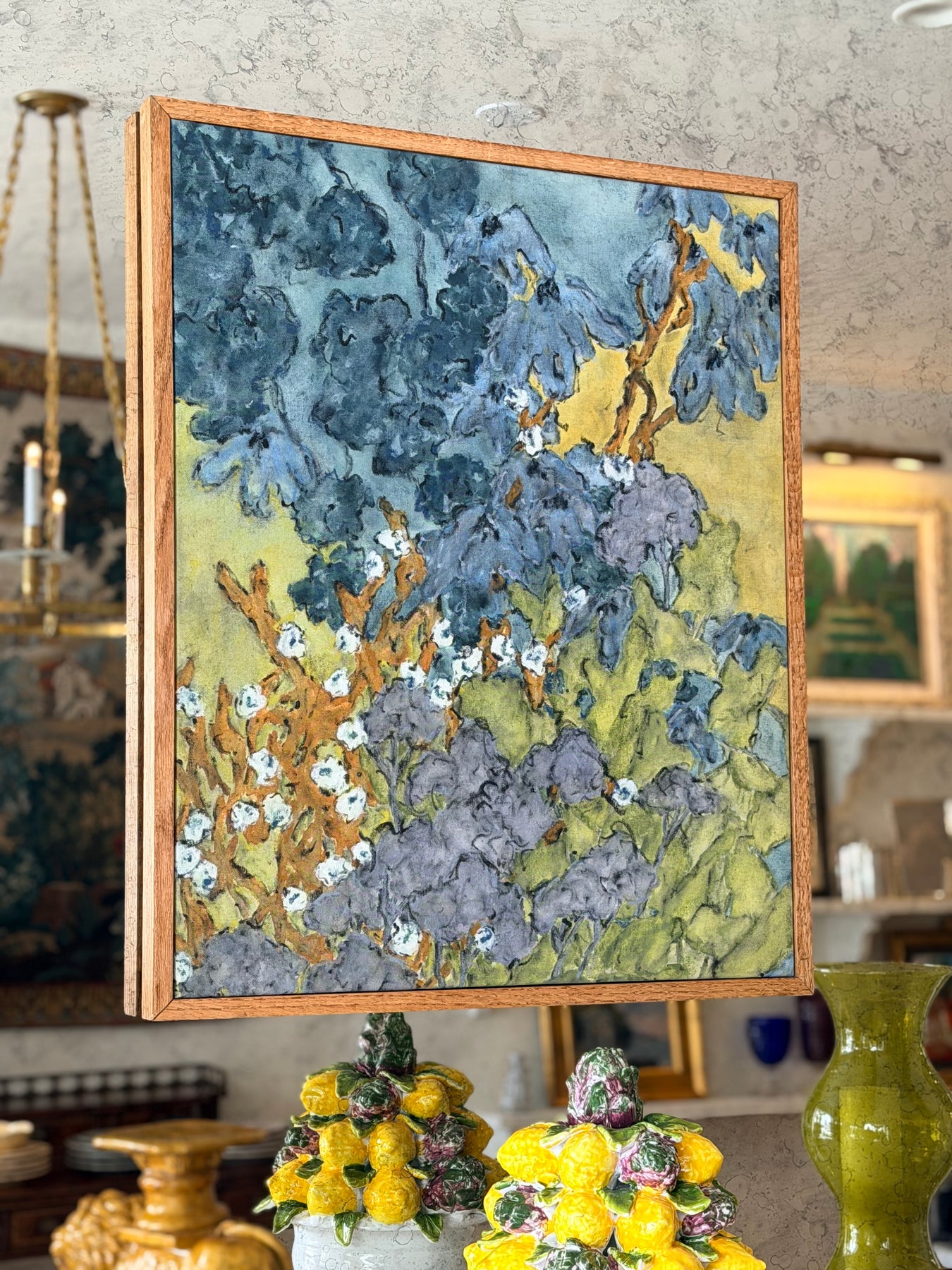 At 26 by 32 inches, the scale offers strong presence while remaining versatile. Presented in a natural wood frame that complements the warmth of the raw canvas, the work sits comfortably within both contemporary interiors and more layered, transitional spaces.