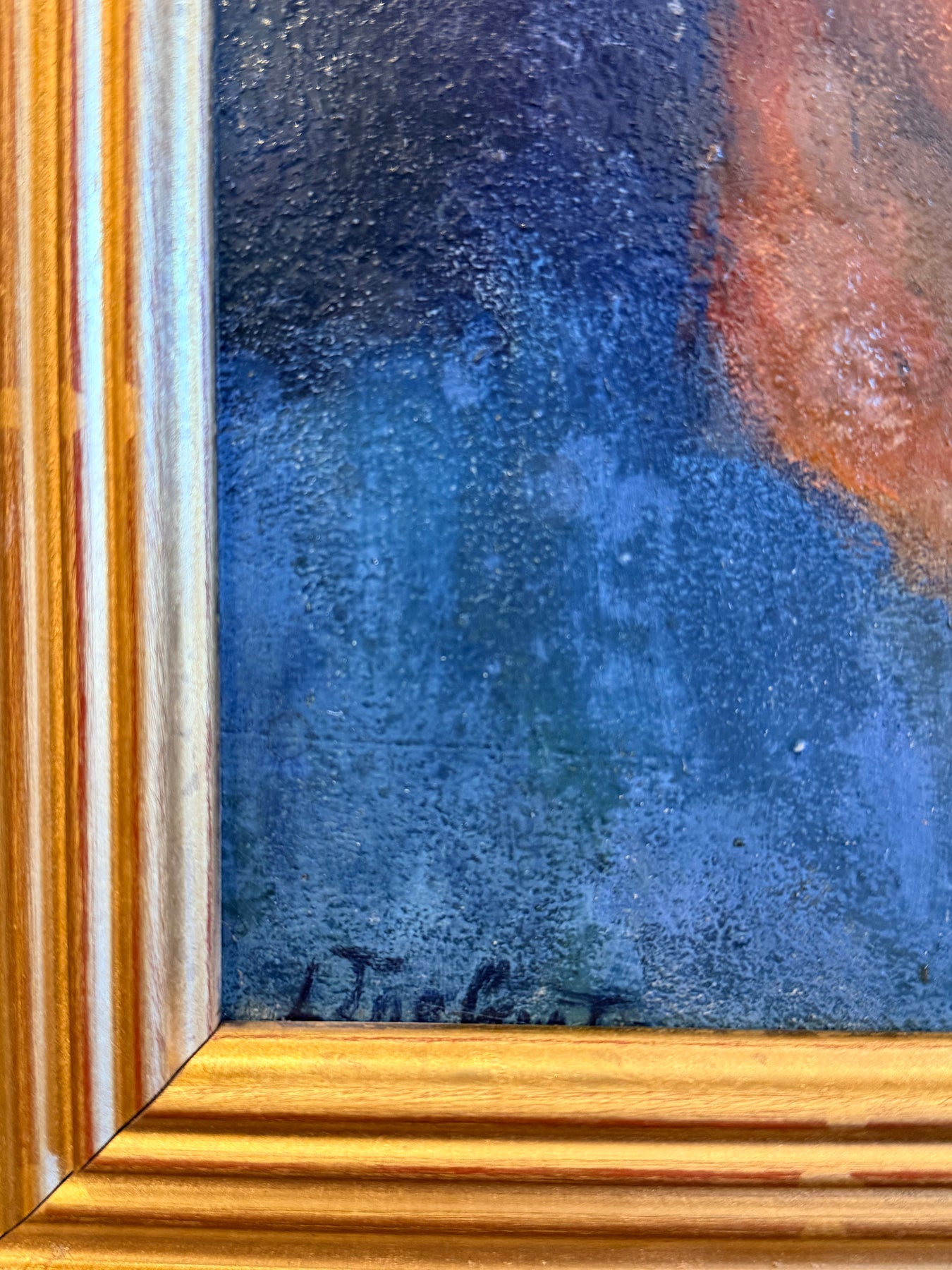 The work is housed in a substantial gilt wood frame that complements its tonal harmony and lends it a refined, gallery-quality presence. Though signed lower left, the signature is indistinct.