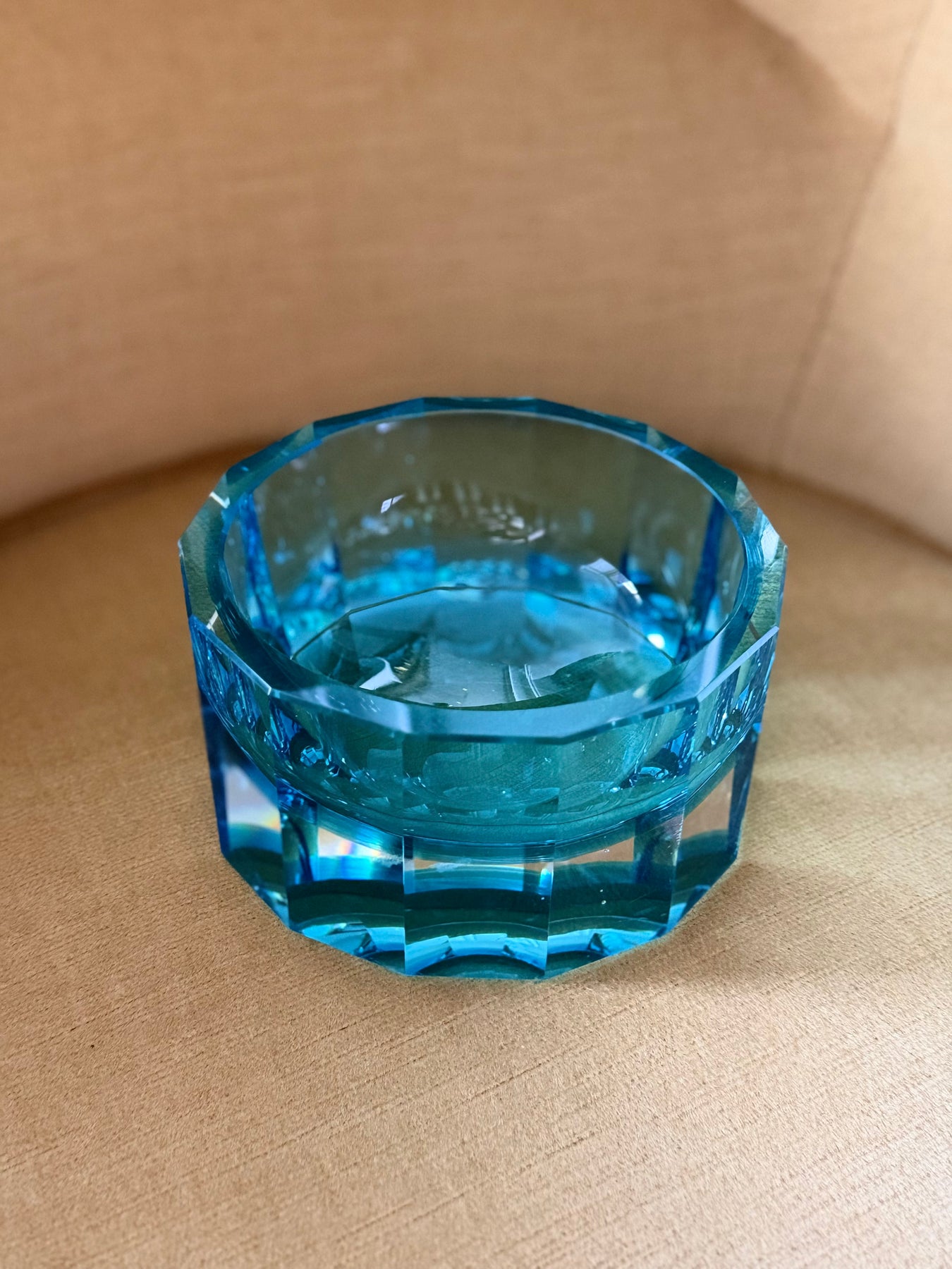 A striking faceted crystal catchall or ashtray made by Moser, celebrated for their precision-cut glass and saturated jewel tones. This substantial piece features an octagonal silhouette with deeply beveled edges and a radiant aqua blue hue that shifts beautifully in natural light. Its weight and clarity exemplify the hallmarks of fine Czech crystal craftsmanship.