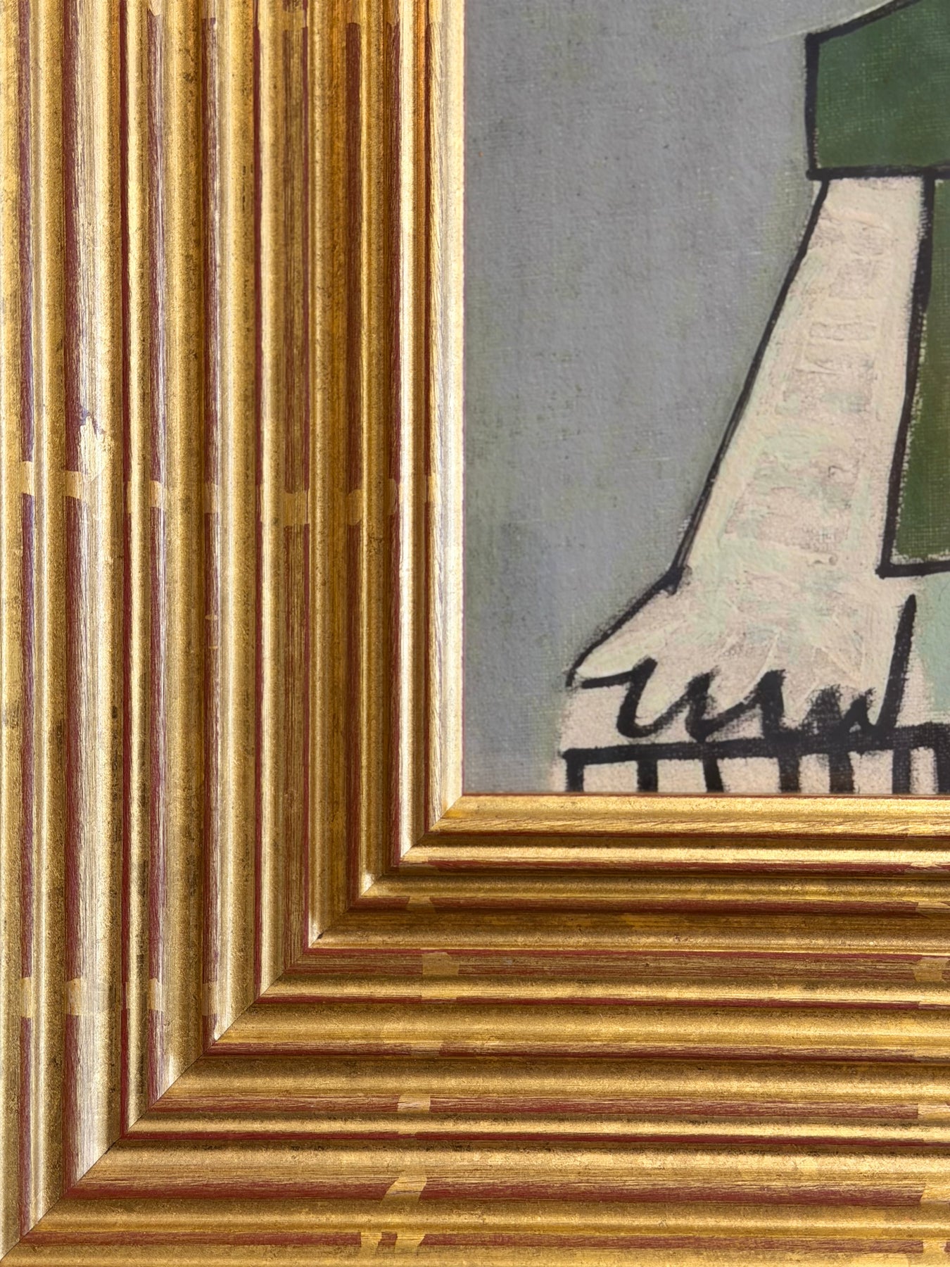 The subject’s asymmetrical visage, graphic contour lines, and muted palette of soft greys, black, and green reflect Picasso’s continued investigation into psychological presence and formal abstraction. The seated pose, a recurring motif throughout his career, is treated here with confidence and immediacy, balancing figuration with modernist distortion.