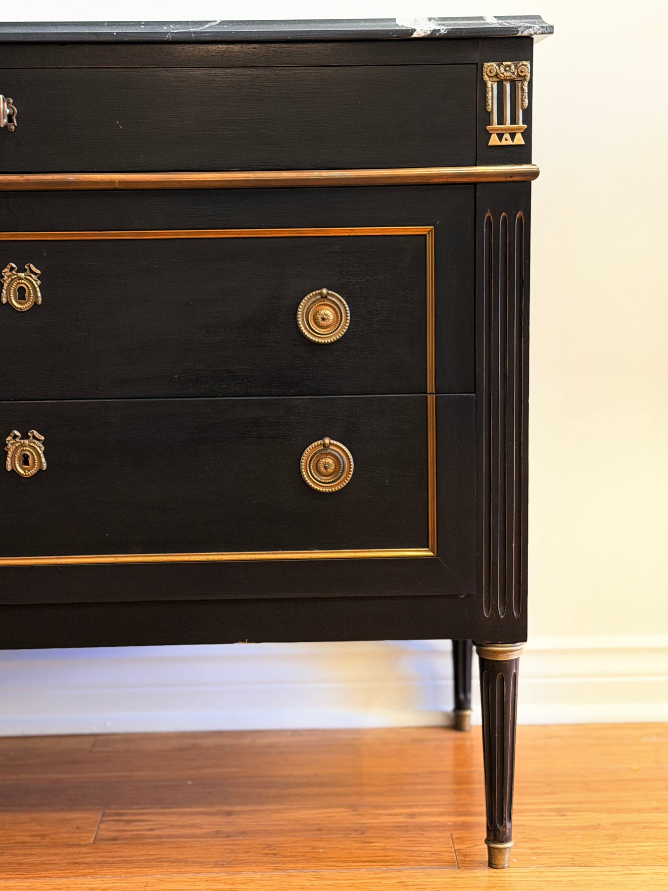 This commode exemplifies the refined restraint of the Directoire period, updated in a mid-20th century context with bold contrast and clean geometry. The deep ebonized finish beautifully offsets the warmth of the gilt accents and the cool sophistication of the marble top, making it a versatile anchor piece for both traditional and modern interiors.