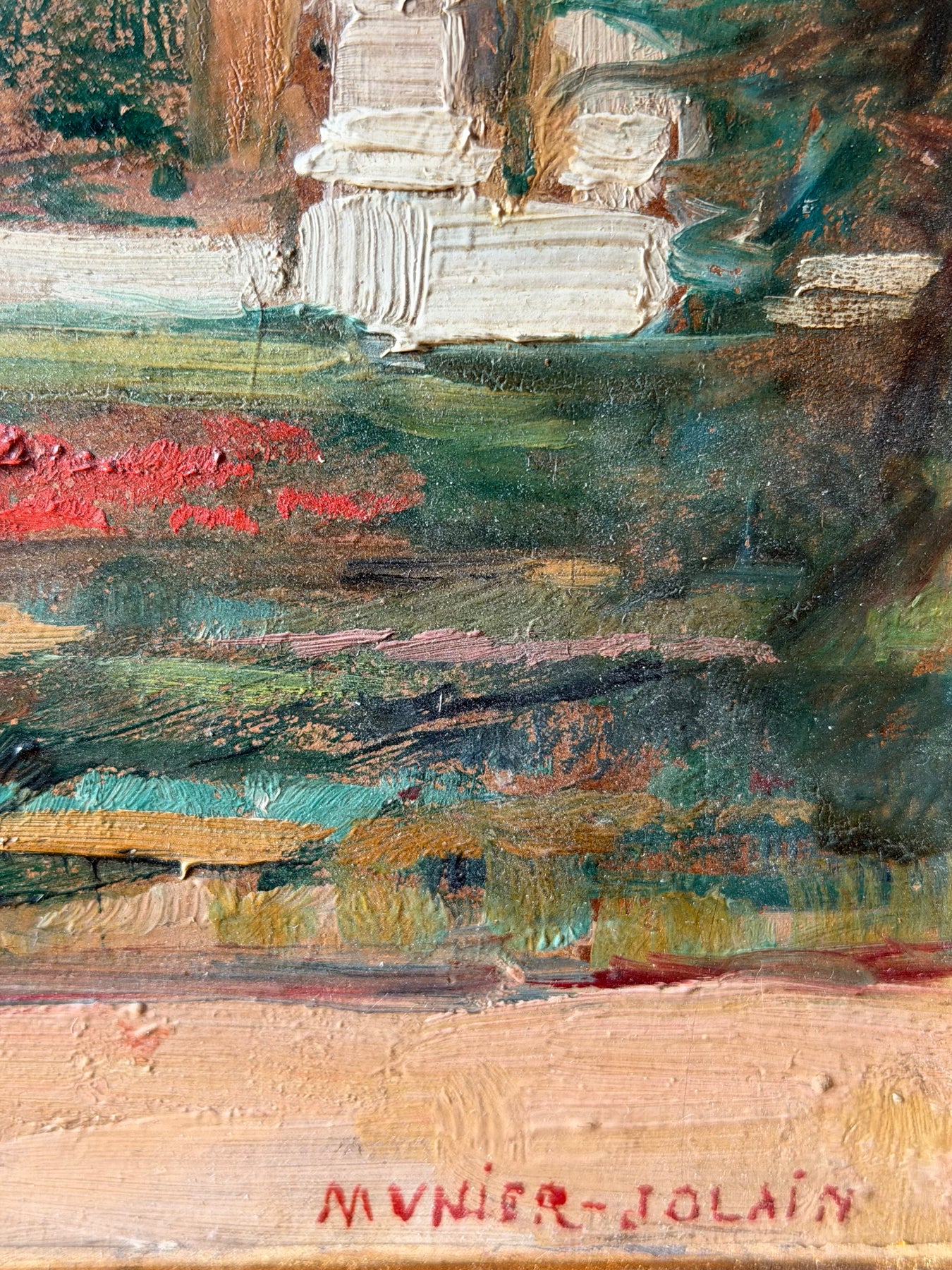 Signed Munier Jolaine lower right. The reverse bears a period label identifying the subject as “Fra Trianon ved Versailles”, further supporting the attribution and location. Housed in a handsome giltwood frame that complements the painting’s warm tones and classical subject matter.