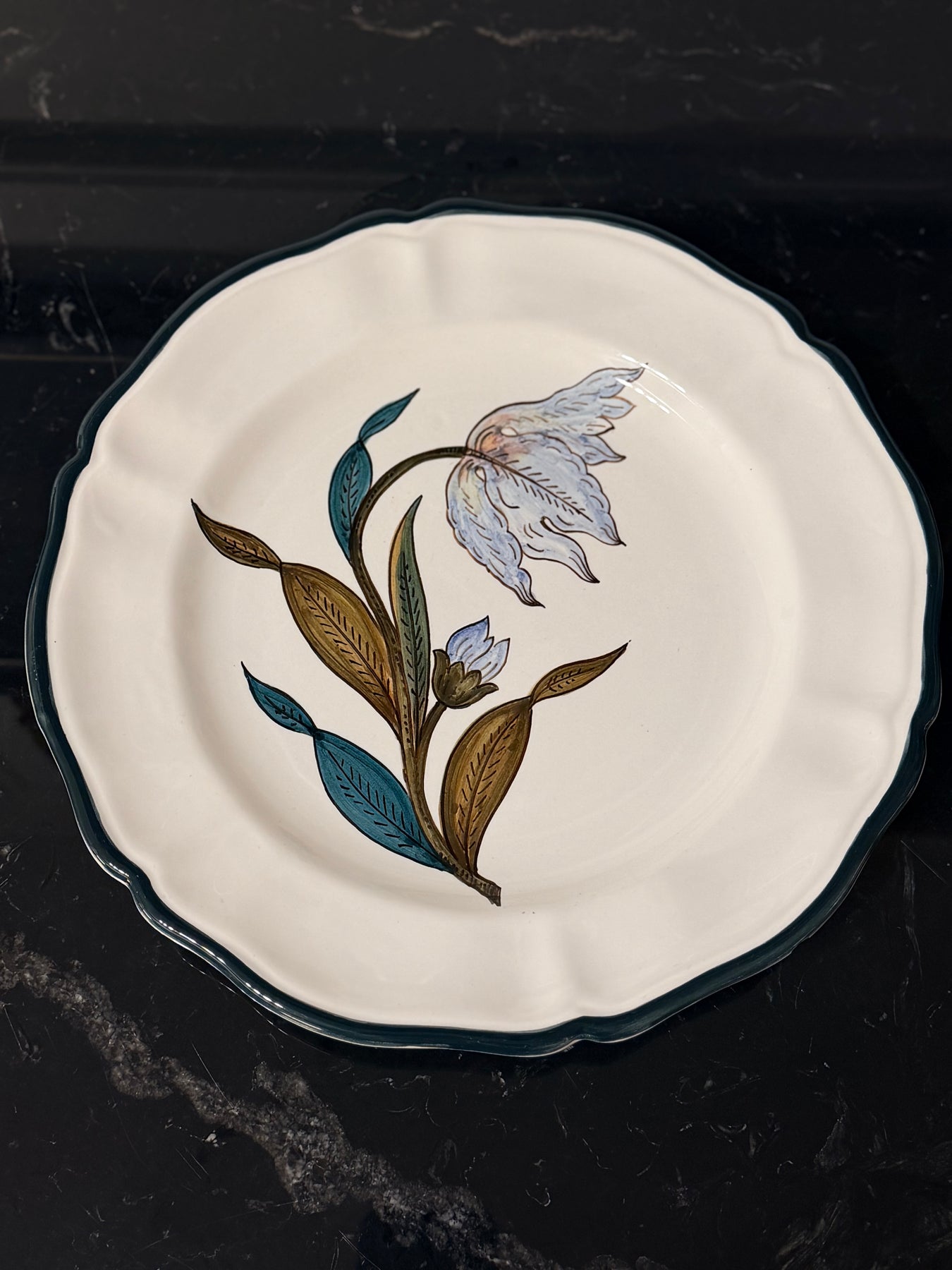 The plates are generously scaled with gently scalloped rims, a classic Deruta form that balances decorative presence with functional elegance. Each composition is individually painted, giving the set subtle variation and the unmistakable character of hand craftsmanship.