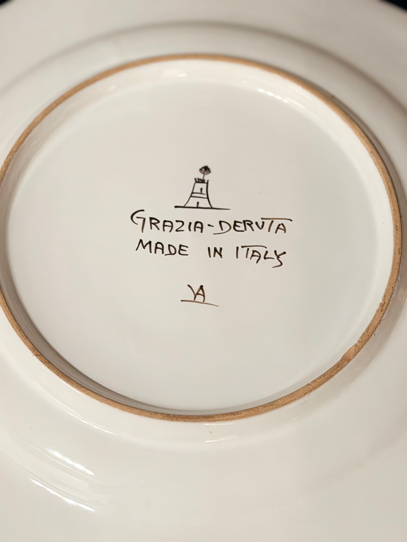 The reverse of each plate is marked Grazia Deruta – Made in Italy, confirming their origin and quality. These plates are well suited for use as decorative wall displays, charger plates, or as part of a layered table setting where artisanal European ceramics are celebrated.