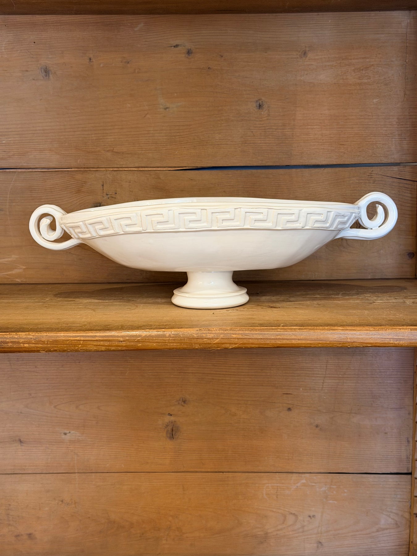 The amphora is adorned with a hand-applied Greek key relief—a classic motif symbolizing infinity and unity—circling its rim with rhythmic precision. Scroll handles at each side curve elegantly, balancing the low, wide bowl with a sense of symmetry and ease. Crafted and glazed by hand in a creamy white finish, each piece bears subtle marks of the maker’s touch, celebrating its one-of-a-kind nature.